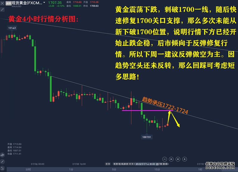 近期美国通胀再创新高,7月加息100点概率高达80%,那么美联储大幅加息预期不断升温,对金价是一种承压!这种预期短期内将对金价形成较为明显的压制,而且可能会持续至7月27日利率决议公布前。那么从4小时行情走势来看,金价的冲高强势回踩,跌回所有的涨幅,甚至打破1700一线,但是随后行情小幅反弹收复1700上方,短线附近,随后下跌修复底部结构,那么对于今日的操作思路而言,博旺建议反弹做空依旧为主导。回踩逢低短多的思路进行布局!