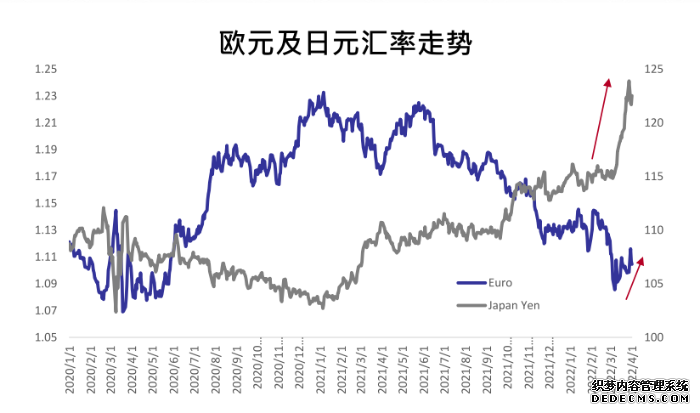 短期看,美联储加大对抗通胀力度,美元汇率有望阶段性走强,俄乌战争令避险情绪上升,支持美元走强。欧洲央行紧跟美联储步伐,阶段性欧元与美元走势趋同,反而日本央行反通胀态度暧昧,调整货币政策较迟缓。因此,美元、欧元汇率有支持,唯日元偏弱。尽管欧元区经济好于日本,但通胀压力明显大于日本。