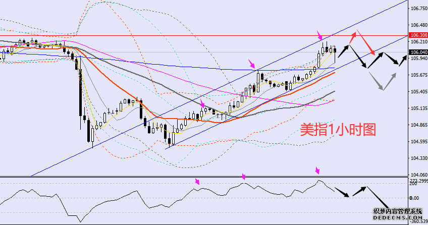 晚间美指暂看承压106.3回修,下方关注106-105.8一带回踩测试,如果今日收于其下,则技术上继续看美指进行波段级别回修调整预期,如果行情收于其上,尤其是收于106上方,那么后面做好风险防范,美指可能会继续异常波动,给操作上也会带来极大的难度和风险。